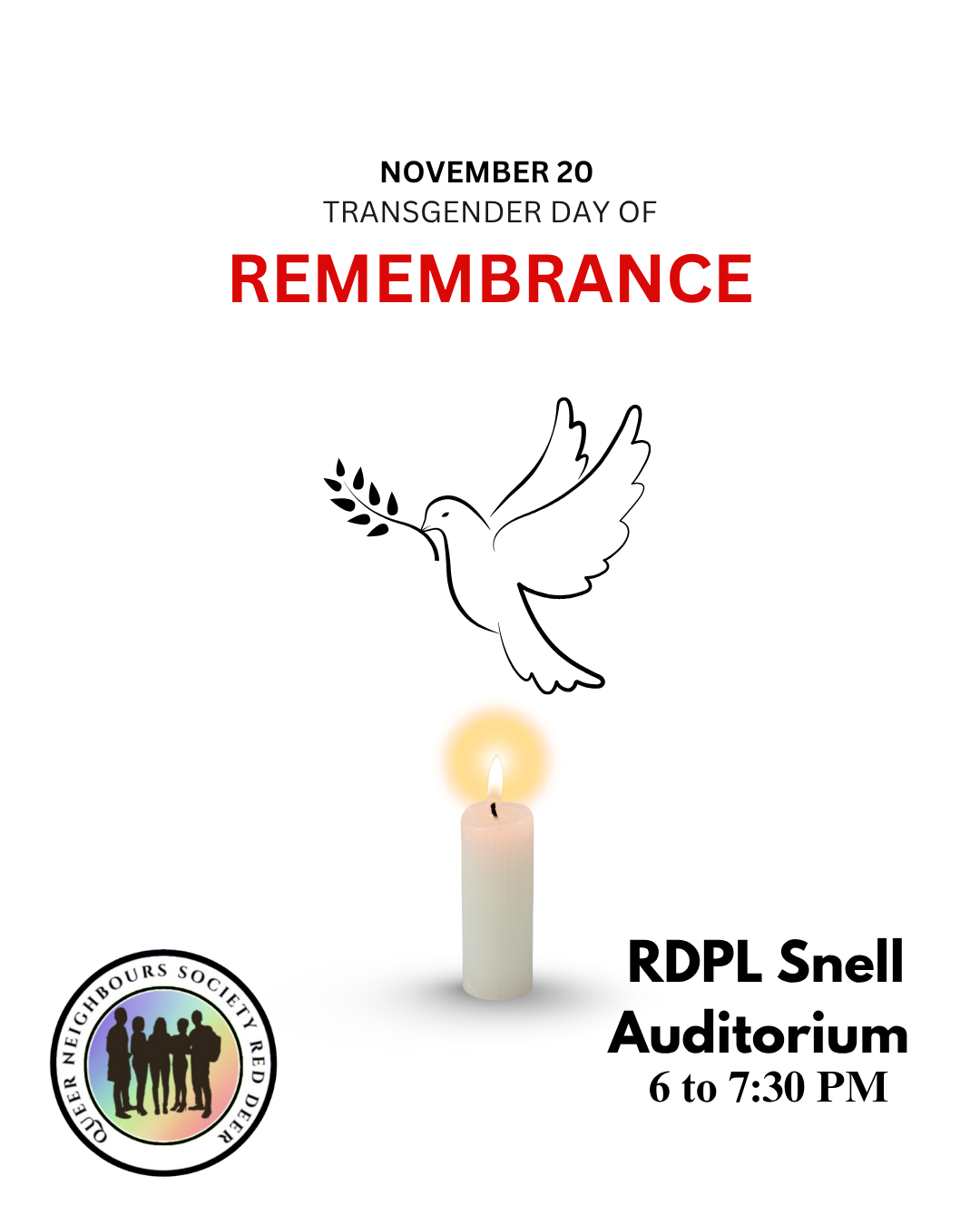 Join QNSRD on November 20 from 6-7:30 PM to commemorate Transgender Day of Remembrance. There will be a presentation, light snacks, and a chance for people to talk about their experiences.