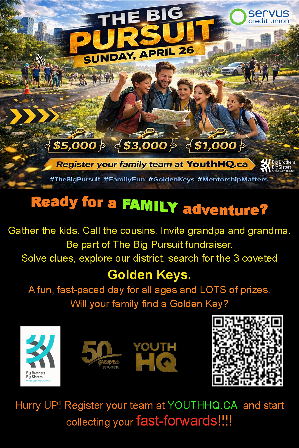 The 2026 BIG Pursuit is a takeoff of the Amazing Race, and the pledging campaign starts on March 2, 2026 and concludes on BIG Pursuit event day on Sunday, April 26 2026. This is the primary annual fundraising event in support of Big Brothers Big Sisters of Red Deer and District.