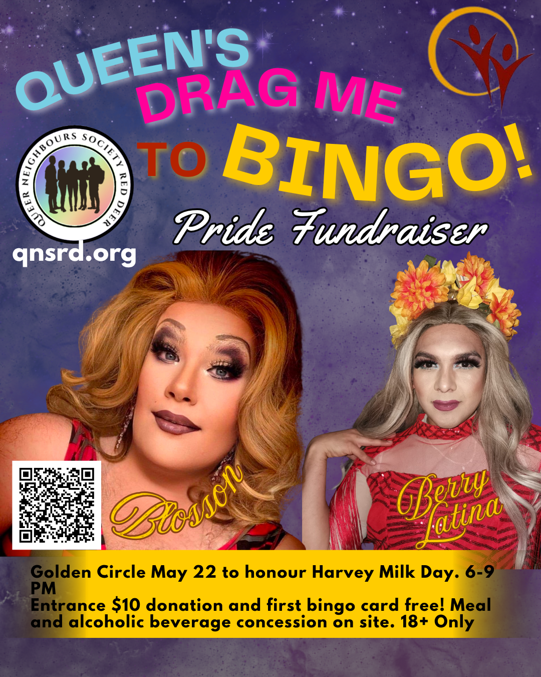 Thanks to the Golden Circle for generously providing us with the venue, volunteers, and our own hot meal concession with alcoholic beverages available! All proceeds from ticket sales and bingo card sales goes toward Queer Neighbour's Society year-round programming and any small extras during Pride Season. With four monthly events, adult and youth support groups, a clothing closet hosted out of our office in the Sendero Centre (by appointment only) we've always got something to offer.