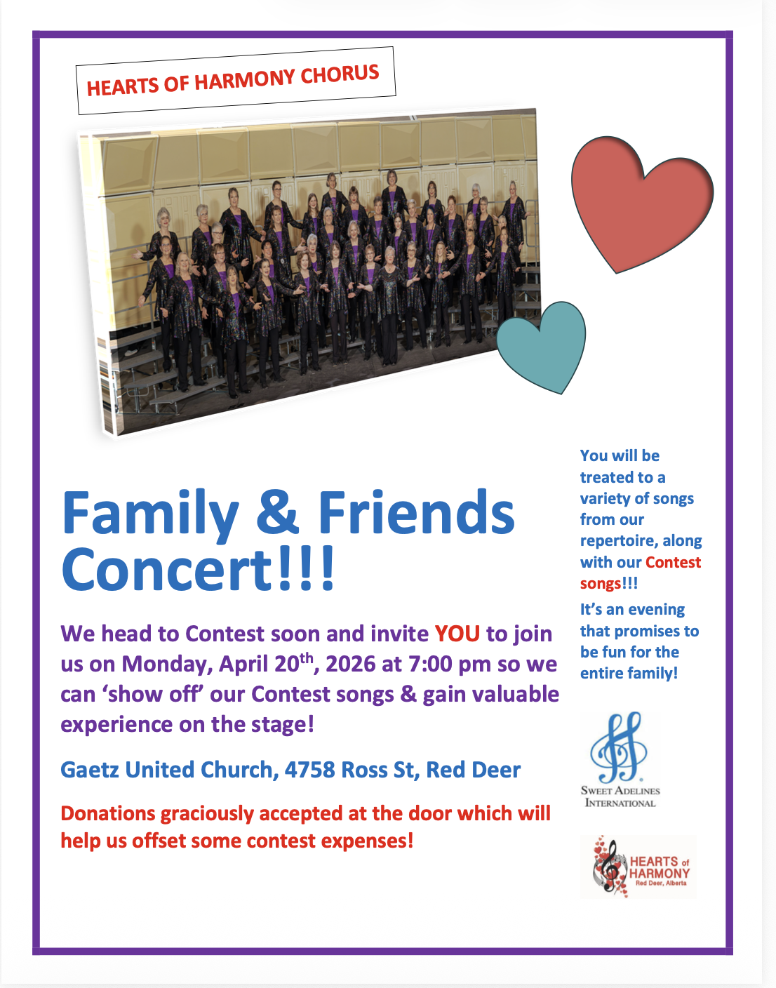 We are Red Deer's premiere, award winning chorus within Region 26 of Sweet Adelines International who sing 4 part harmony, barbershop style, a cappella and we are preparing for the competition stage so we need YOU!