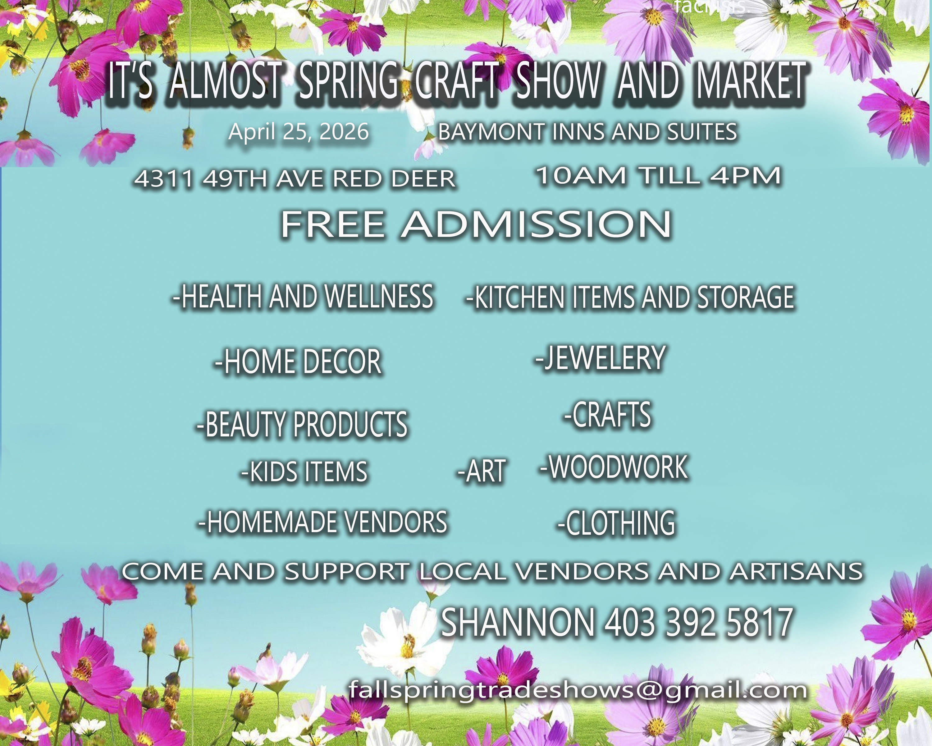 Join us Sat April 25th from 10-4 at the Baymont Inn Red Deer (4311 49th ave) for The It's Almost Spring Craft Show and Market! A huge ballroom of amazing vendors and artisans ready to showcase all their gift ideas or come down and spoil yourself with all the awesome items you will find! The show offers free admission, free parking and free gift card and basket draws! Cant wait to see you all there!