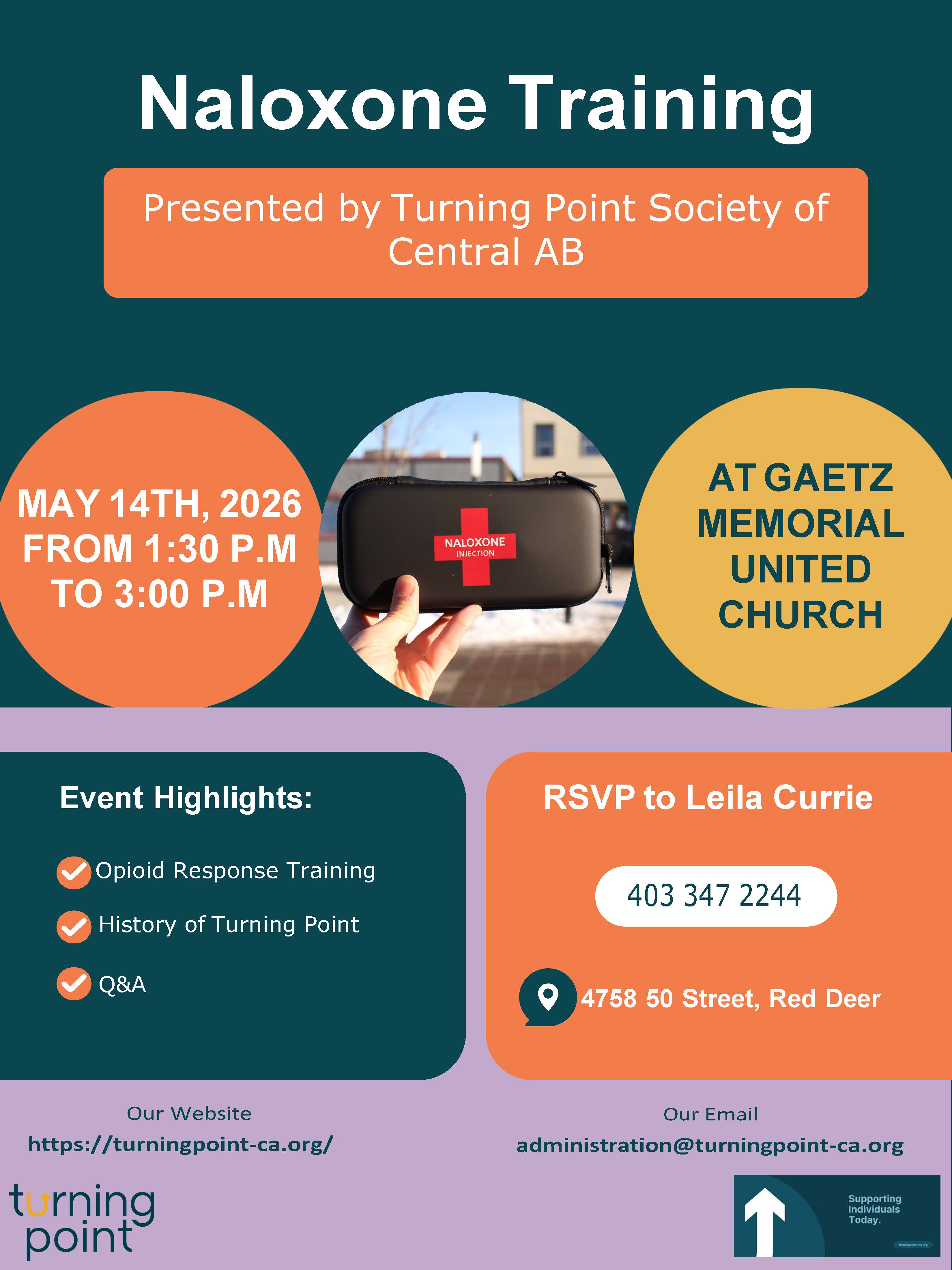 Participants will receive practical instruction from experienced facilitators with Turning Point Society of Central Alberta and will have the opportunity to ask questions. In addition to the training, the session will include an overview of the history of Turning Point, highlighting its mission, community impact, and ongoing efforts to support harm reduction and wellness across Central Alberta.
