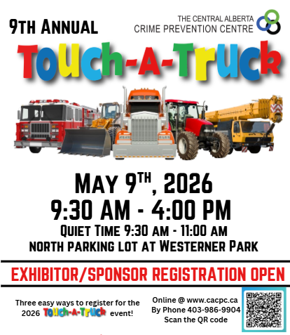 Touch-a-Truck is brought to you by the Central Alberta Crime Prevention Centre. This family-friendly event gives kids of all ages a chance to see their favourite trucks, tractors, and equipment up close and offers the opportunity to meet people who work in policing, EMS, firefighting, construction, oilfield agriculture and more!