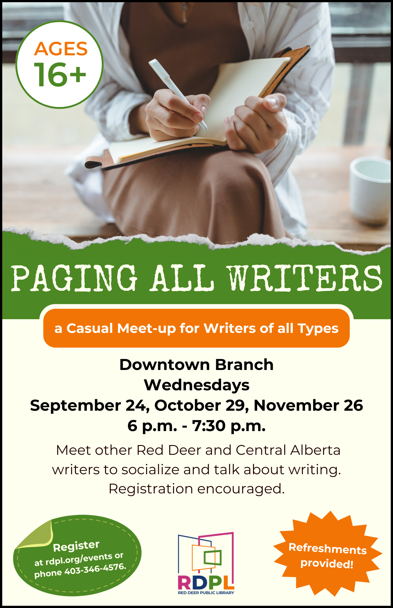 Meet other Red Deer and Central Alberta writers to socialize and talk about writing.Registration encouraged but not necessary.